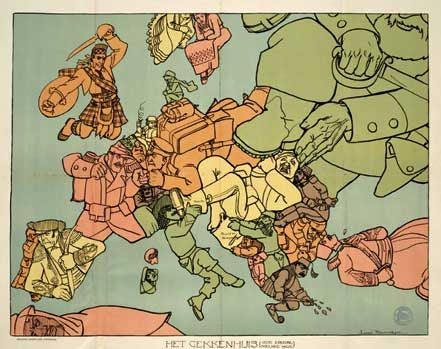 De afbeelding is een kaart van Europa in 1914. De afbeelding is door een Nederlander gemaakt. De afbeelding laat zien hoe groot de machten waren van de landen. Je kan duidelijk zien dat er een gevecht plaatsvindt. Alle landen zijn getekend als mensen, zo kan je goed zien wie met wie vecht. Je ziet dat Frakrijk met Duitsland vecht en dat Rusland Oostenrijk-Hongarije probeert te onderdrukken. En dat het Verenigd-Koninkrijk mee probeert te knokken van links boven. Als je kijkt naar Nederland dan ligt Nederland lekker te luieren. Dit klopt ook wel want Nederland deed niet mee met de eerste wereldoorlog. De afbeelding is gemaakt door Louis Raemaekers een Nederlander. De bron is objectief want je het is een feit dat iedereen tegen elkaar vecht. En deze bron laat het alleen nog een stukje beter zien. Ik denk dat het geschilderd is door een neutraal iemand want hij schildert de een niet beter dan de ander.