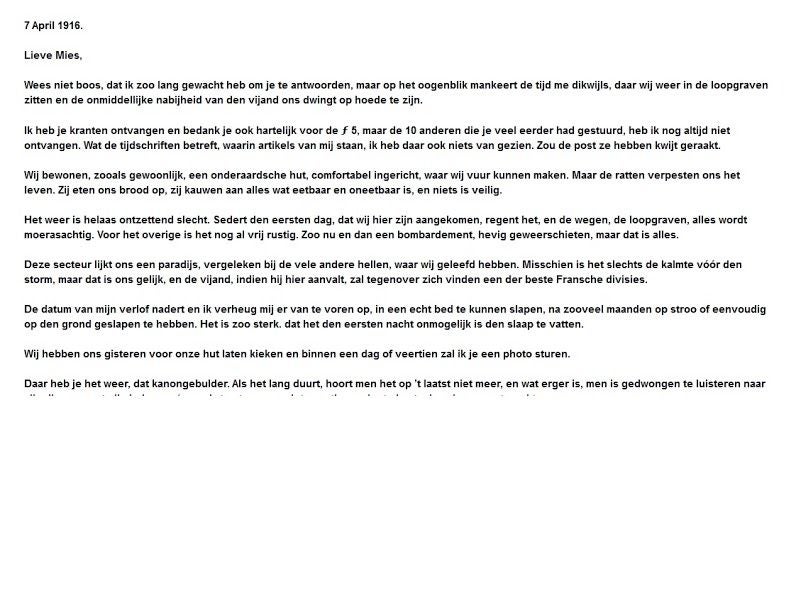 Dit is een brief die is geschreven tijdens de eerste wereldoorlog. Het is waarschijnlijk geschreven door een voorstander van de triple entente omdat hij zit te wachten op de vijand in een loopgraaf. En in de eerste wereld oorlog waren de voorstanders van de triple entente de verdedigende partij. En hij heeft het over de beste Fransche divisies. De soldaat heeft deze brief geschreven naar waarschijnlijk zijn vriendin of zijn moeder. Hij verteld over zijn verblijf tijdens de oorlog, en dat hij hoopt dat hij snel weer naar huis mag.